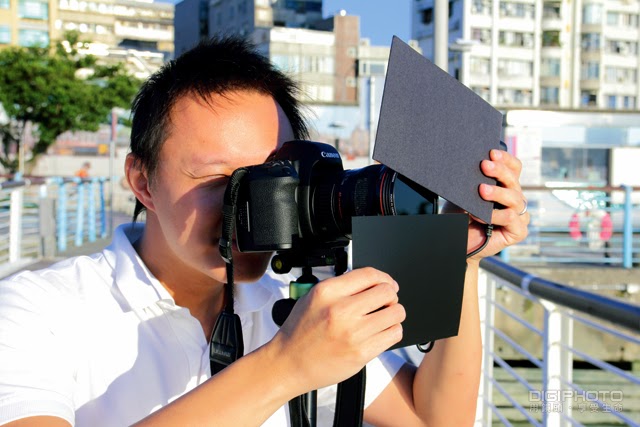 狹縫黑卡的概念就跟相機上的快門簾是類似的,黑卡上的這條縫可以針對畫面上高光低光不同區域,隨著移動的快慢來做曝光時間長短的控制。它可以處理的狀況很多,舉一個很明顯的例子就是大湖公園,在拍攝日出的時候為了不讓拱橋的部分變成剪影,就可以用黑卡上的這條縫,先在橋身和橋的倒影那塊區域上下來回,讓這個區域多曝光一點,最後由下往上抽起來,就可以讓拱橋和背後山脈都呈現出細節。
